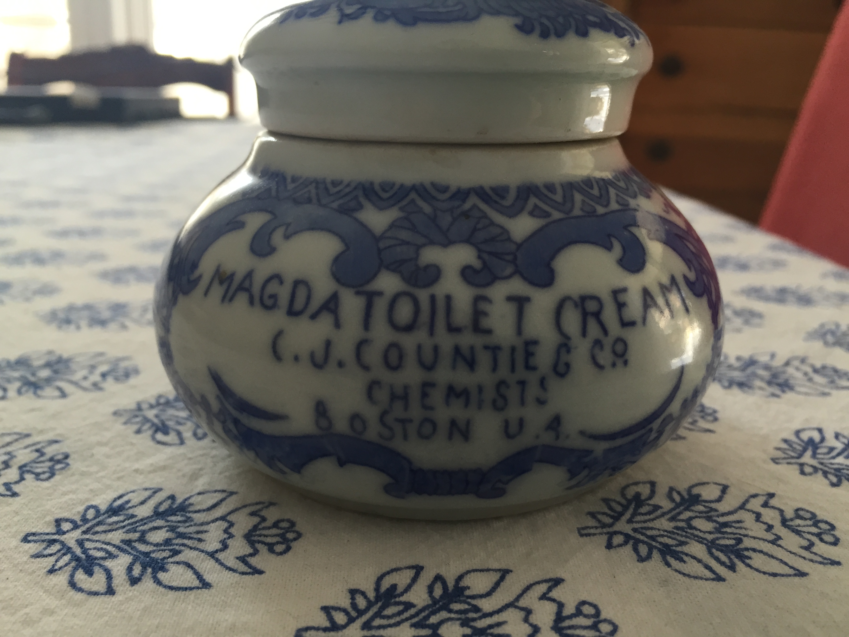 Dear Sherry, A couple of years ago, my Aunt Jeanette Countie gave me one of the original jars that belonged to the Sister of what would have been my great – great Uncle Charles Countie’s formula for his popular face cream MAGDA TOILET CREAM. Here is a little more history,The drugstore on Charles St. in Boston was in the front of Beacon Hill. He created this cream that had enormous popularity at the time, even with American actress Lillian Russell. He sent to China to have these little jars made for the cream. (He later sold the formula to Pond’s) The jar I got is larger and quite wonderful. I notice on eBay at times, people either will sell the cover alone or the whole jar. The original jars are Countie of Boston on the top. MAGDA TOILET CREAM is on one side with C.J. COUNTIE & Co CHEMISTS BOSTON U.S.A under the O in Co it has .. If this jar reads COUNTIE of CHICAGO, it is not the original authentic jar. (like anything nice, it is a duplicate from the original jar). I believe this to be the rest of the history to the story of the wonderful pottery jar called MAGDA TOILET CREAM. My Aunt Jeanette passed away last year and this was a letter of the story that she wrote to me in her own handwriting. Thank you Sherry for keeping the legacy of this jar continuing.. Lori (Countie) Bermani. Boston, Ma. August 2020