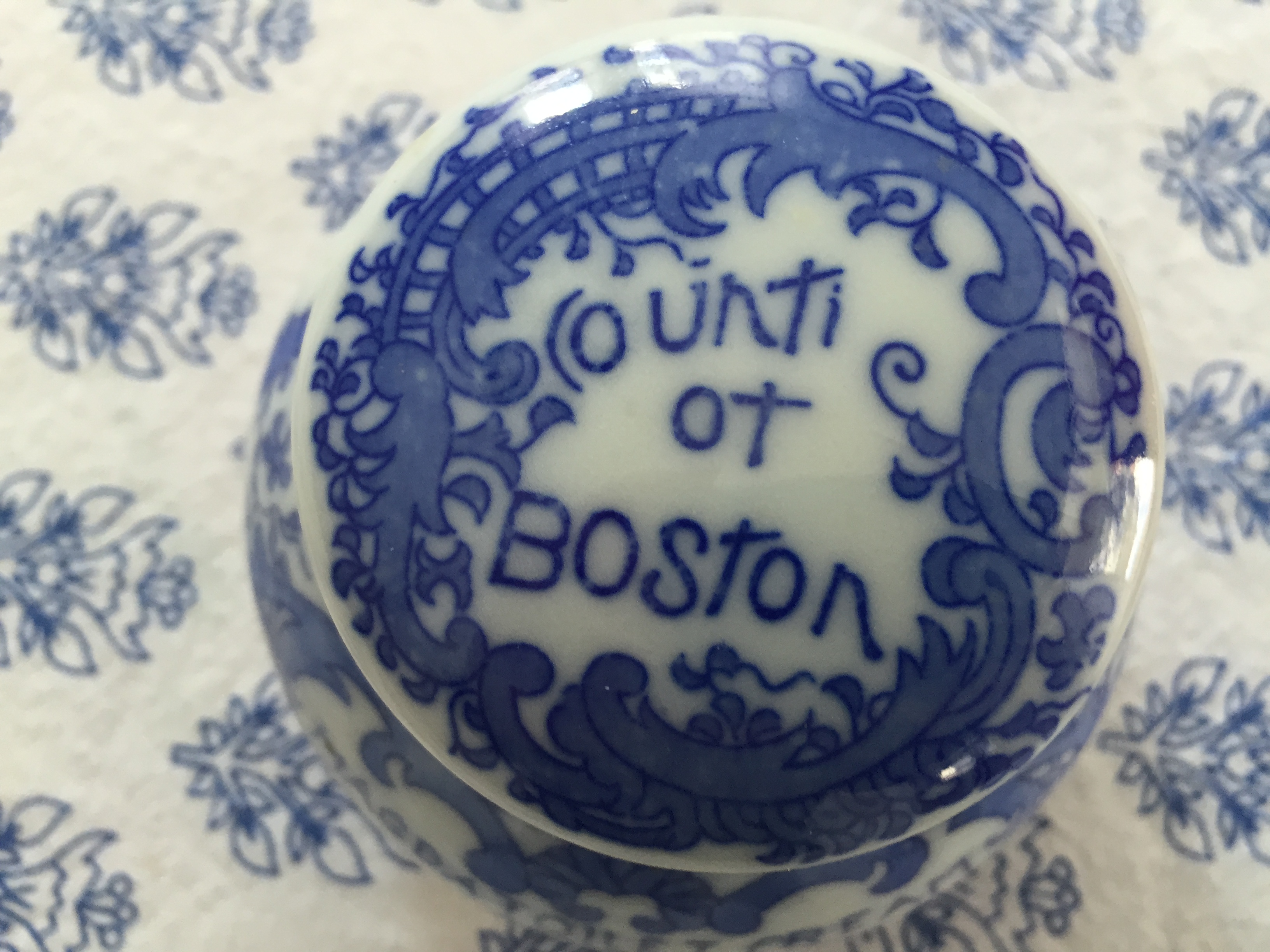 One day when I was wandering around an antique store in Concord, Massachusetts I found the beautiful little jar below. I loved it for two reasons — it was blue and white and it said Boston on it.