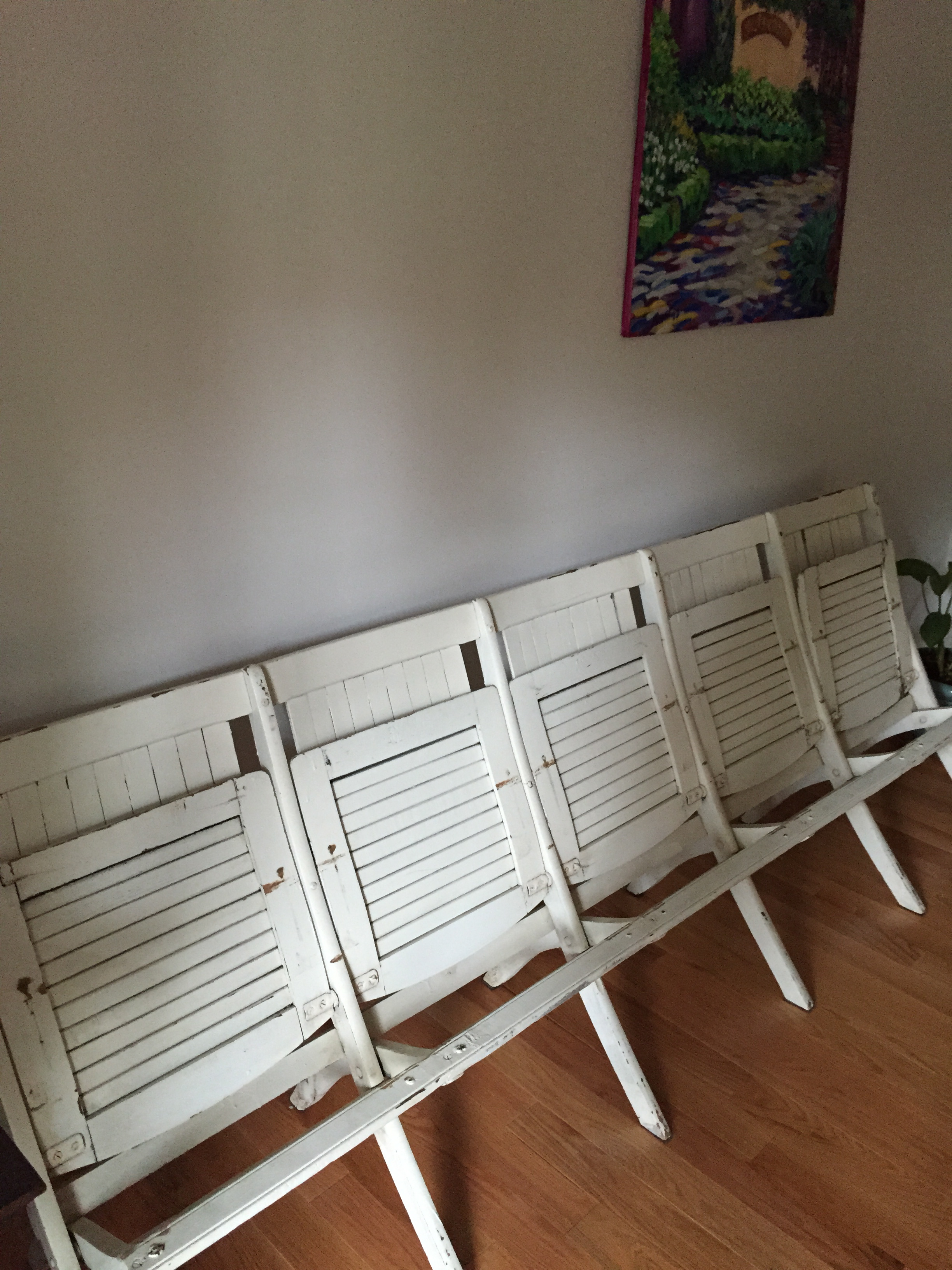 When we lived in Monterey, California I had a friend who enjoyed bargain hunting as much as I did. One of our adventures led us to a small shop in Santa Cruz, California. There we found two identical benches. IMG_5975The woman who ran the shop said the benches were from an expo in San Francisco and that a woman had bought a bunch of them to use for her daughter’s outside wedding. When the seat is flipped up it does say Exposition Auditorium. IMG_5977San Francisco had two big expos — the Panama-Pacific International Exposition (also called the World’s Fair) and the Golden Gate International Exposition 1939-1940. I’m not sure if the bench is from one of those two events or not. No matter, I love it. The back is one long piece of wood that’s been curved. IMG_5976